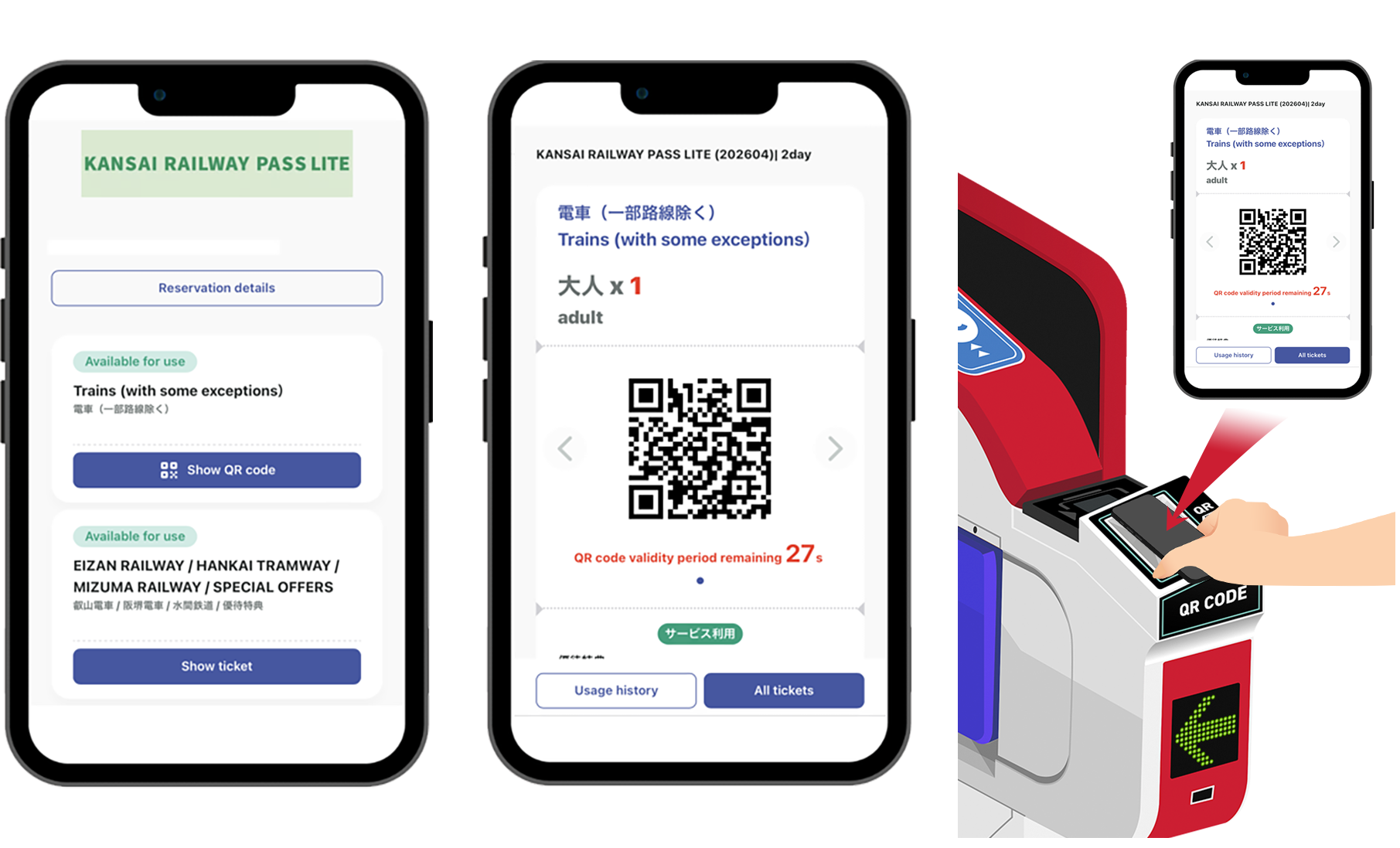 Press the "Trains(with some exceptions)" tab. A QR code will appear on your screen. To enter or exit, scan the QR code with your mobile device at any ticket gate that recognizes QR codes. Only one person should pass through it at a time.