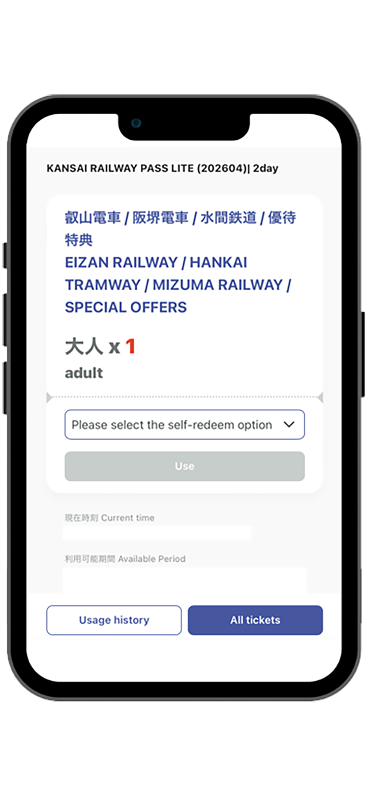 - Tap the “EIZAN RAILWAY / HANKAI TRAMWAY / MIZUMA RAILWAY / SPECIAL OFFERS” tab. Select the train or Special offers you want to use, then tap “Use”.