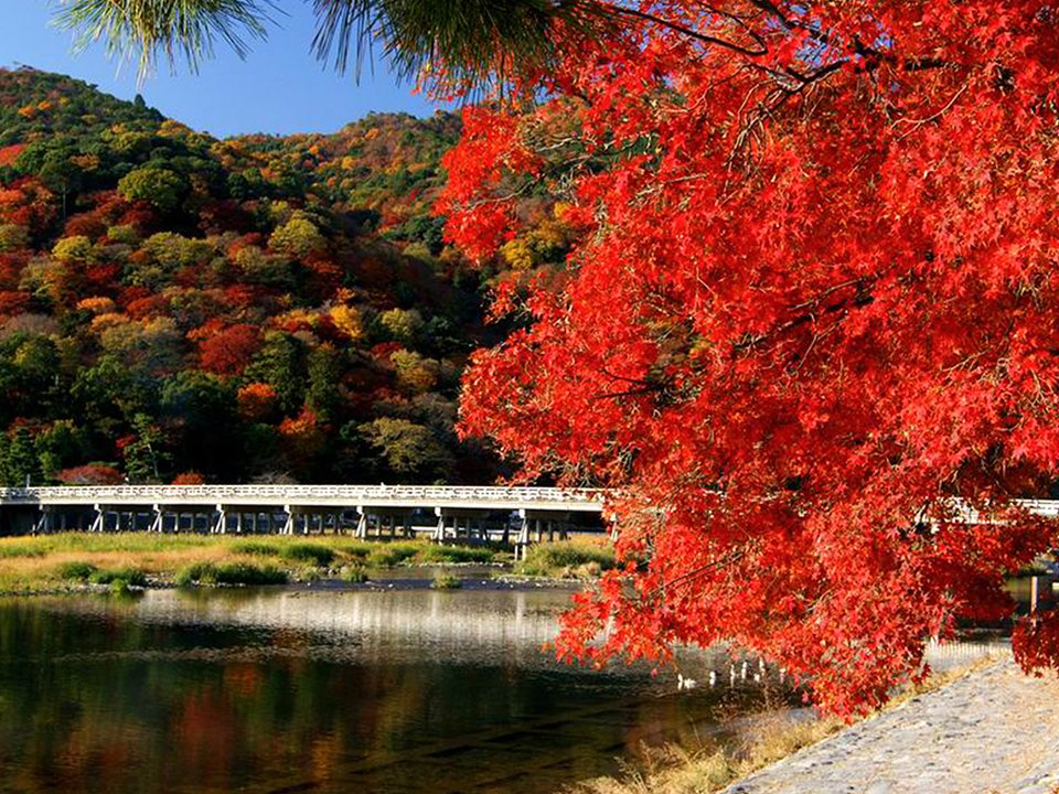 Majestic mountains loom beyond the Togetsukyo Bridge over the Katsuragawa River.